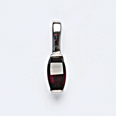 Stříbrný přívěsek je zdoben přírodním granátem. Rozměr přívěsku na výšku je 21 mm a na šířku 5 mm. Orientační váha přívěšku je 1,36 g. Materiál je stříbro 925/1000.