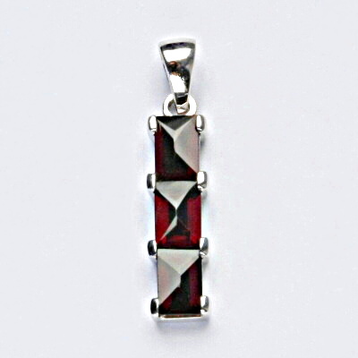 Stříbrný přívěsek je zdoben přírodními granáty. Rozměr přívěsku na výšku je 26 mm četně očka a na šířku 5 mm. Orientační váha přívěšku je 2,08 g. Materiál je stříbro 925/1000.