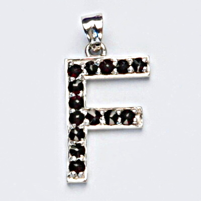 Stříbrný přívěsek ve tvaru písmenka F je zdoben přírodními granáty o průměru 2,5 mm. Rozměr přívěsku na výšku včetně očka je 28 mm a na šířku 14 mm. Orientační váha přívěšku je 2,26 g. Materiál je stříbro 925/1000.