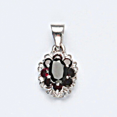 Stříbrný přívěsek je zdoben přírodními granáty. Rozměr přívěsku na výšku je 25 mm a na šířku 13 mm. Orientační váha přívěšku je 4,57 g. Materiál je stříbro 925/1000.