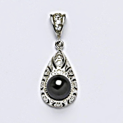 Stříbrný přívěšek s černou umělou perlou.Velikost umělé perly je 6 mm. Velikost přívěšku je 32 mm.