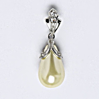 Stříbrný přívěšek s krémovou umělou perlou ve tvaru slzy.Velikost umělé perly je 15x10 mm. Velikost přívěšku je 32 mm.