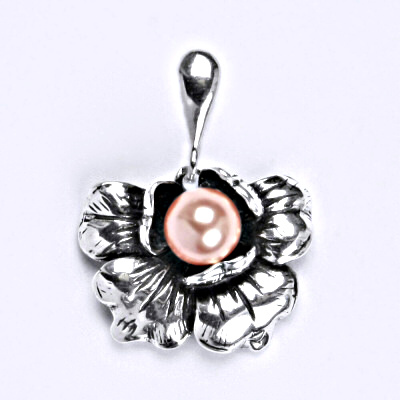 Stříbrný přívěšek s umělou perlou růžovou. Průměr perly je 6 mm. Velikost přívěšku je 24 mm. Materiál je stříbro 925/1000.