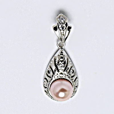 Stříbrný přívěšek se světle růžovou umělou perlou.Velikost umělé perly je 6 mm. Velikost přívěšku je 32 mm.