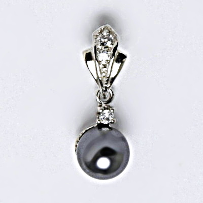 Stříbrný přívěšek s šedočernou umělou perlou.Velikost umělé perly je 6 mm. Velikost přívěšku je 23 mm.