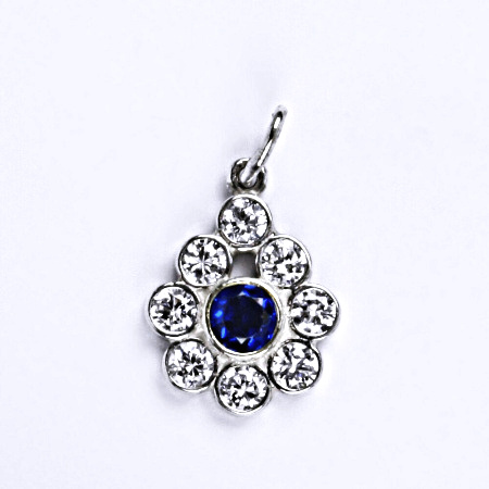Stříbrný přívěšek se spinelem a čirými zirkony. Celková výška přívěšku je 19 mm. Materiál je stříbro 925/1000. Orientační váha přívěsku je 1,29 g.