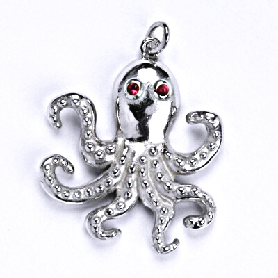 Stříbrný přívěšek se syntetickými rubíny ve tvaru chobotnice. Velikost přívěšku i se závěsem je 30 mm. Materiál je stříbro 925/1000.