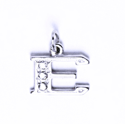 Stříbrný přívěšek ve tvaru písmenka "E" s bílým syntetickým zirkonem. Velikost přívěšku i s ouškem je 16 mm.