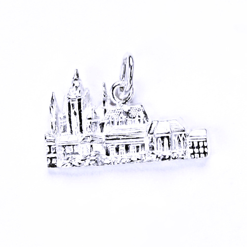 Stříbrný přívěšek Pražský Hrad, Hradčany. Rozměr přívěšku je 13 mm včetně očka a 20 mm na šířku. Orientační váha přívěšku je 2,03 g.