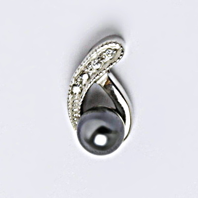Stříbrný přívěšek se šedočernou umělou perlou. Průměr umělé perly je 6 mm. Velikost přívěšku je 18 mm.