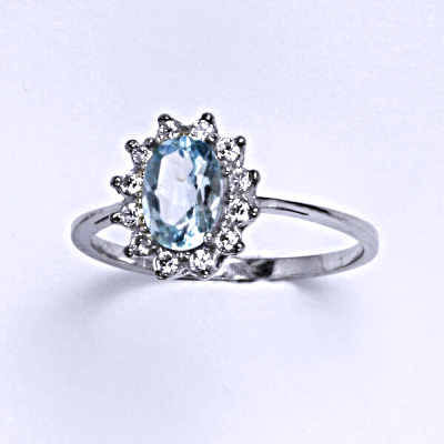 Stříbrný prsten s přírodním kamenem - topaz sky a čirými zirkony. Velikost kamenu je 7x5mm. Materiál je stříbro 925/1000.
