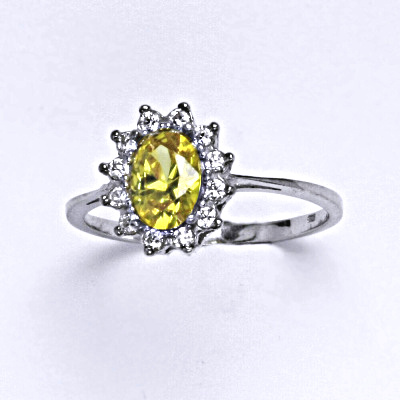 Stříbrný prsten se žlutým zikronem a malými čirými zirkony. Velikost zirkonu je 7x5mm. Materiál je stříbro 925/1000.
