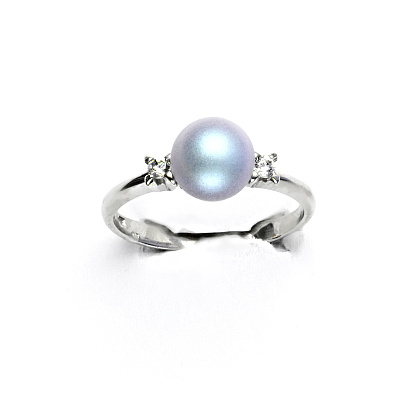 Stříbrný prsten se Swarovski perlou iridescent light blue zasazenou mezi dvěma zirkonky čiré barvy. Průměr perly je 8 mm, průměr zirkonu 2 mm. Orientační hmotnost prstene ve velikosti 58 je 2,74 g. Vyhotoveno ze stříbra ryzosti 925/1000.