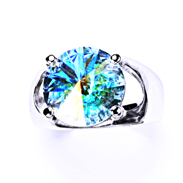 Stříbrný prsten má průřezy na stranách a je zdoben Swarovski krystalem velikosti 12 mm.Barva krystalu je AB Crystal. Prsten je vyroben ze stříbra 925/1000 a má povrchovou úpravu čisté Rhodium.