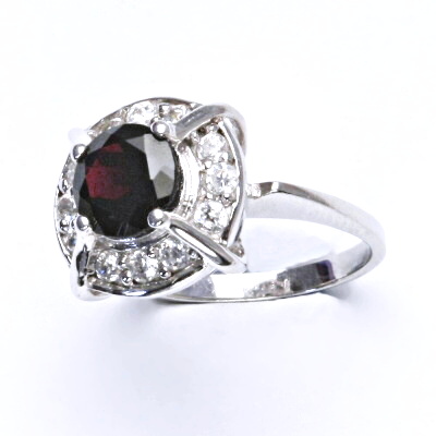 Stříbrný prsten je zdoben přírodním granátem a čirými zirkony. Rozměr zdobné části prstenu je 14 mm. Orientační váha prstenu je 6,26 g. Materiál je stříbro 925/1000. Prsten máme skladem ve velikosti 56.