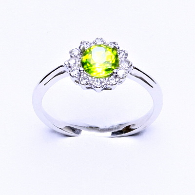 Stříbrný prsten, přírodní olivín, čiré zirkony, T 1495