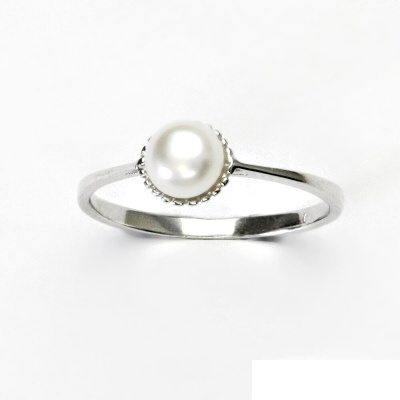 Stříbrný prstýnek je zdoben stříbrnou přírodní říční perlou o průměru 5 - 5,5 mm. Materiál je stříbro 925/1000. Prstýnek má povrchovou úpravu čisté rhodium.