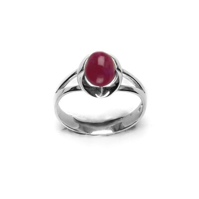 Stříbrný prsten zdobený přírodním rubínem 8x6 mm. Orientační hmotnost prstene ve velikosti 54 je 2,58 g.