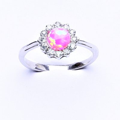 Stříbrný prsten, růžový syntetický opál, čiré zirkony, T 1495