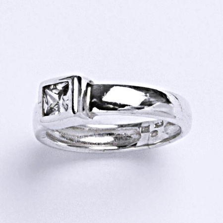 Stříbrný prsten s čirým zirkonem. Velikost zirkonu je 4 x 4 mm. Materiál je stříbro 925/1000. Prsten má povrchovou úpravu čisté rhodium.