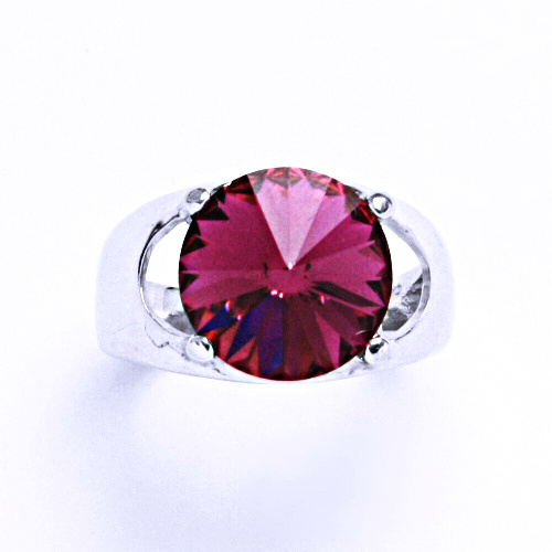 Stříbrný prsten s průřezy na stranách.K výrobě byl použit krystal Swarovski velikosti 12mm.Barva Fuchsia.Na tyto prstenové šperky byla použita povrchová úprava čisté Rhodium,která nezpůsobuje žádné alergické reakce.K tomuto prstenu lze na našem E-shopu
