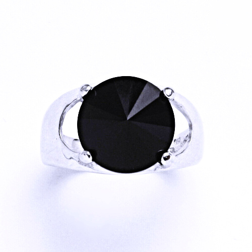 Stříbrný prsten s průřezy na stranách.K výrobě byl použit krystal Swarovski velikosti 12mm.Barva Jet.Na tyto prstenové šperky byla použita povrchová úprava čisté Rhodium,která nezpůsobuje žádné alergické reakce.K tomuto prstenu lze na našem E-shopu obj
