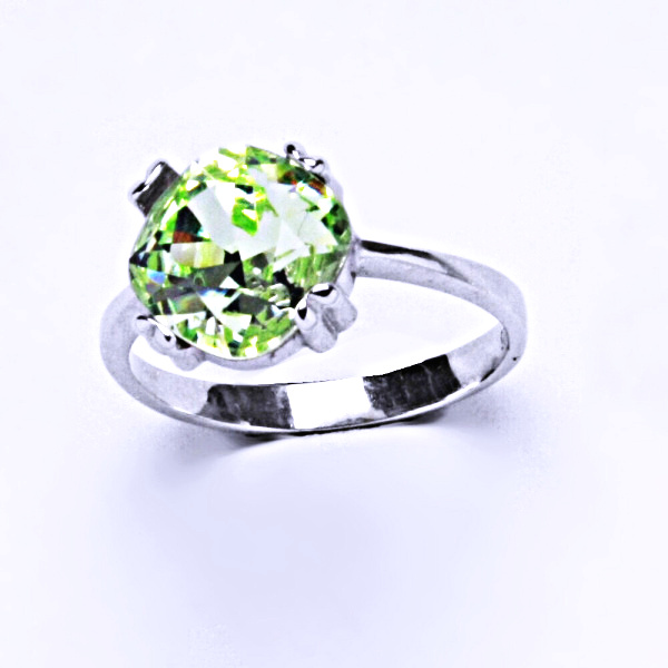 Stříbrný prsten s krystalem Swarovski barvy chryzolit.Velikost krystalu - 10 mm.Tyto šperky jsou s povrchovou úpravou - čisté Rhodium, která nezpůsobuje žádné alergie.K prstenu nabízíme i náušnice nebo přívěsek do soupravy.