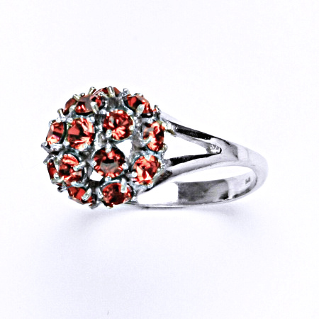 Stříbrný prsten s krystalem swarovski ve tvaru půlkoule. Barva swarovski krystalu je paparadscha. Kameny jsou pevně uchyceny v kovu, záruka na vypadávání. Tyto šperky se dají zakoupit do soupravy s koulemi, které najdete v naší nabídce.