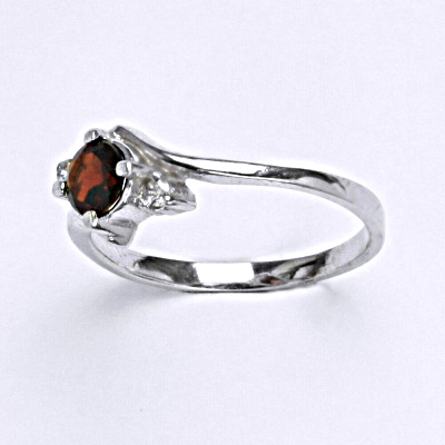 Stříbrný prsten s přírodním granátem a s čirými zirkony. Velikost kamene je 5 mm. Materiál je stříbro 925/1000. Prsten má povrtchovou úpravu čisté rhodium.