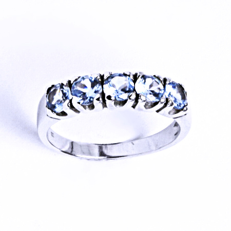 Tento stříbrný prsten je zdoben syntetickým akvamarínem. Velikost každého kamene je 4 x 4 mm. Prsten patří mezi šperky s povrchovou úpravou čistého rhodia. Materiál je stříbro 925/1000.