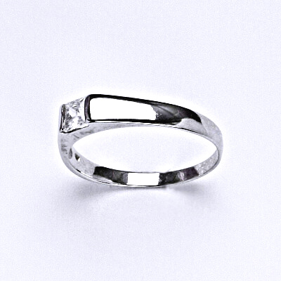 Stříbrný prsten se syntetickým čirým zirkonem. Velikost zirkonu je 4 x 4 mm. Prsten patří mezi šperky s povrchovou úpravou čistého rhodia. Materiál je stříbro 925/1000.