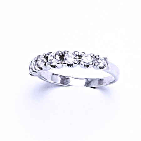 Tento stříbrný prsten je zdoben sedmi čirými zirkony. Velikost největšího kamene je 3 x 3 mm. Prsten patří mezi šperky s povrchovou úpravou čistého rhodia. Materiál je stříbro 925/1000.