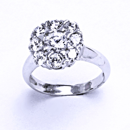 Tento stříbrný prsten tvaru kytky je zdoben čirými zirkony. Průměr kytky je 14 mm. Prsten patří mezi šperky s povrchovou úpravou čistého rhodia. Materiál je stříbro 925/1000.