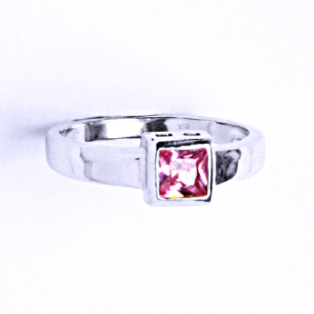 Tento stříbrný prsten je zdoben růžovým zirkonem o velikosti 5 x 5 mm. Prsten patří mezi šperky s povrchovou úpravou čistého rhodia. Materiál je stříbro 925/1000.