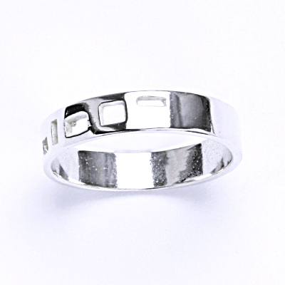 Stříbrný prsten zdobený výřezy čtvercového a obdelníkového tvaru, k dostání i v nestandardních velikostech včetně XL. Prsten má netradiční a velice atraktivní design, lze jej využít i jako snubní. Šířka obroučky je 4,5 mm, orientační hmotnost šperku 2,14 g (ve velikosti 54). Vyhotoveno ze stříbra ryzosti 925/1000.