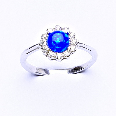 Stříbrný prsten, tmavě modrý syntetický opál, čiré zirkony, T 1495