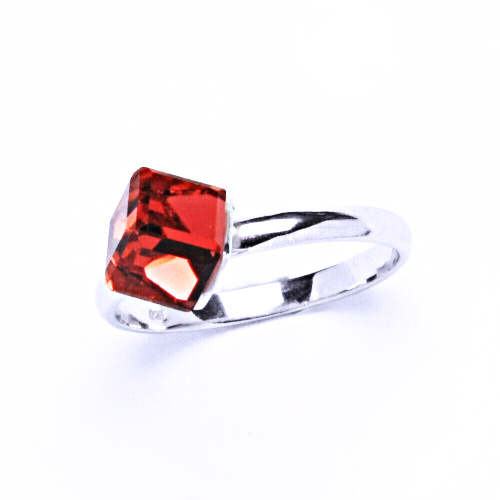 Stříbrný prsten s krystalem Swarovski.Krychle má velikost 6x6 mm.padparadscha.Velmi kvalitní přilepení minimalizuje riziko ztráty.Tyto šperky mají povrchovou úpravu - čisté Rhodium,které nevyvolává žádné alergické reakce.K tomuto prstenu nabízí náš E-s