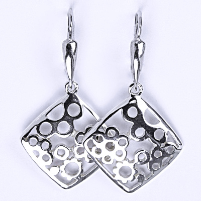 Stříbrné náušnice visací se zapínáním na patent, čtverečky s kytičkami. Materiál je stříbro 925/1000. Celková výška náušnice 40 mm. K těmto náušnicím nabízíme na našem E-shopu i přívěsek a prsten do soupravy.