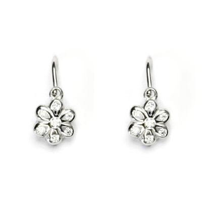 Dětské náušnice z bílého zlata mají tvar kytičky a jsou zdobeny čirými zirkony. Průměr kytičky je 7 mm. Celková výška náušnice je 14 mm. Náušnice mají dětské zapínání. Materiál je zlato 585/1000.