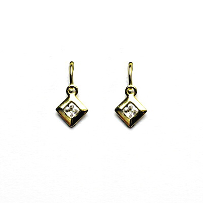 Dětské zlaté náušničky zdobené čirými čtyřhrannými zirkonky o rozměrech 2,5 x 2,5 mm. Celková výška náušnic je 15 mm, zdobná část měří 5 x 5 mm. Náušničky mají zapínání na dětskou brizuru a jsou vyhotovené ze žlutého zlata ryzosti 585/1000. Orientační hmotnost 0,93 g.