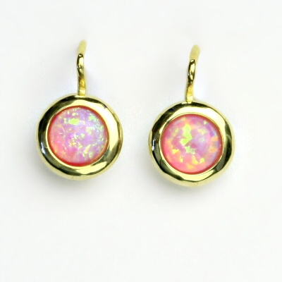 Náušnice ze žlutého zlata jsou zdobeny růžovým syntetickým opálem o průměru 6 mm. Materiál je zlato 585/1000. Orientační váha náušnic je 2,33 g. Celková výška náušnice je 15 mm.