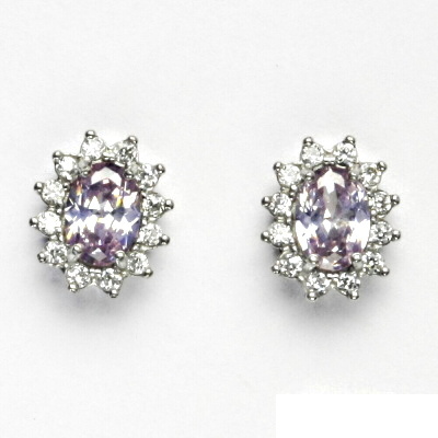Náušnice z bílého zlata jsou zdobeny malými čirými zirkony a zirkonem lavender 7x5 mm. Materiál je zlato 585/1000. Rozměr náušnice je 11x10 mm. Náušnice mají zapínání na šroubek. Orientační váha náušnic je 3,1 g.