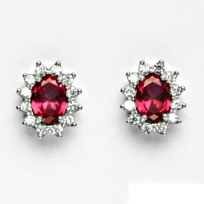 Náušnice z bílého zlata jsou zdobeny malými čirými zirkony a zirkonem v barvě rubínu 7x5 mm. Materiál je zlato 585/1000. Rozměr náušnice je 11x10 mm. Náušnice mají zapínání na šroubek. Orientační váha náušnic je 3,1 g.