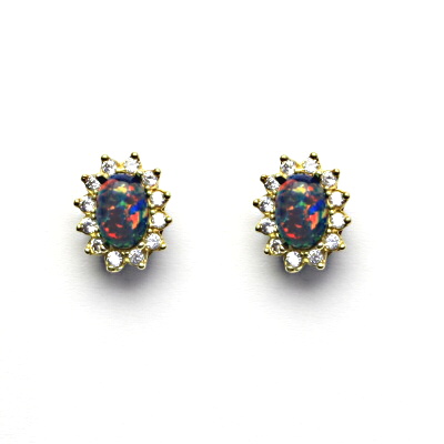Zlaté náušnice zdobí černý syntetický opál 7 x 5 mm, po jehož obvodu jsou zasazeny drobné zirkonky čiré barvy. Náušničky mají zapínání na šroubek a velmi pohodlně se nosí. Šperk působí velice jemným dojmem a perfektně sedí ženám všech věkových kategorií. Orientační hmotnost náušnic je 3,1 g. Vyhotoveno ze žlutého zlata ryzosti 585/1000.