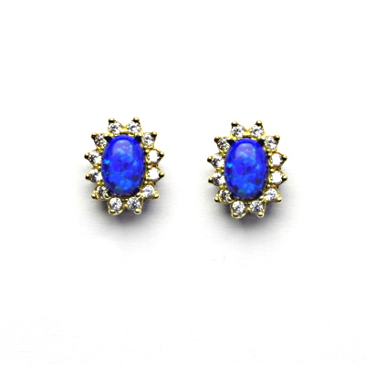 Zlaté náušnice zdobí tmavě modrý syntetický opál 7 x 5 mm, po jehož obvodu jsou zasazeny drobné zirkonky čiré barvy. Náušničky mají zapínání na šroubek a velmi pohodlně se nosí. Šperk působí velice jemným dojmem a perfektně sedí ženám všech věkových kategorií. Orientační hmotnost náušnic je 3,1 g. Vyhotoveno ze žlutého zlata ryzosti 585/1000.
