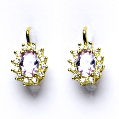 Náušnice jsou vyrobeny ze žlutého zlata. Jsou zdobeny zirkony - lavender o rozměru 7x5 mm a malými čirými zirkony. Materiál je zlato 585/1000. Orientační váha náušnice 3,40 g.
