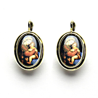 Zlaté náušnice se skleněnými oválky vyobrazujícími Madonu s dítětem, zapínání na klasický patent. Rozměry madonek jsou 14x10 mm. Náušnice měří 23 mm včetně klapky na výšku a 13 mm na šířku, orientační hmotnost 5,3g a více. Vyhotoveno ze žlutého zlata ryzosti 585/1000.