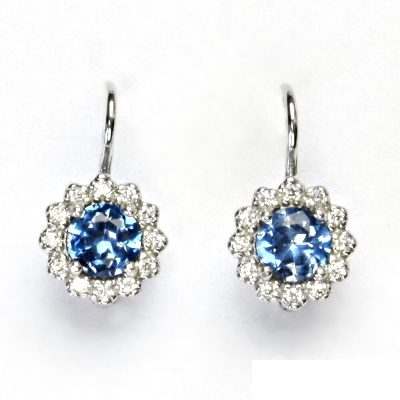 Zlaté náušnice zdobí malé čiré zirkony a zirkon akvamarin o průměru 5,5 mm.
