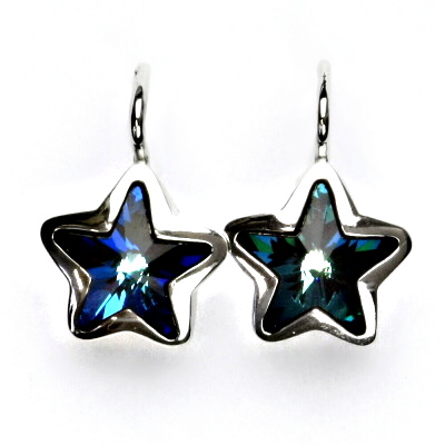 Náušnice z bílého zlata, ve taru hvězdičky, jsou zdobeny Swarovski krystaly - barva bermuda blue. Náušnice mají zapínání na klapku. Materiál je zlato 585/1000. Rozměr zdobné části náušnice je 12x12 mm. Celková výška náušnice je 17,5 mm.