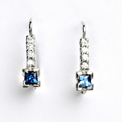 Náušnice z bílého zlata jsou zdobeny čirými zirkony a zirkonem v barvě akvamarinu. Orientační váha náušnic je 2,07 g. Materiál je zlato 585/1000. Náušnice mají zapínání na klapku. Celková výška náušnice je 16 mm.